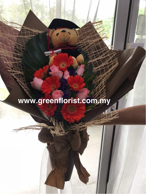 HB 075 - Orange Daisy Mix Pink Roses + Graduation Bear